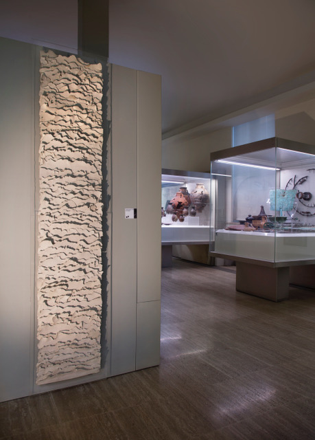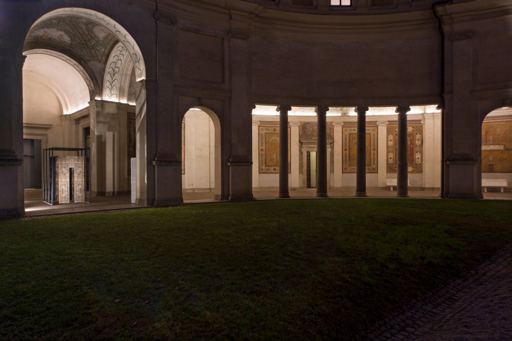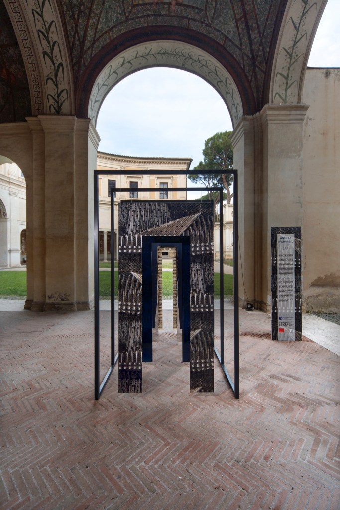L’installazione site – specific GAP, realizzata nell’Emiciclo del Museo Nazionale Etrusco di Villa Giulia, invita ad una riflessione su quanto sta accadendo nel Mediterraneo riguardo all’attuale interruzione di quel flusso di scambi e contaminazioni culturali che da sempre lo hanno caratterizzato. L’opera rappresenta il “Mare nostrum” e le sue sponde, sulle quali sono approdate le epoche della nostra civiltà. La porta è un varco, un passaggio, un limite, un confine effettivo o simbolico che sia, segna un punto di partenza o d’arrivo. E’ uno spazio (de)limitato, emblema di quella condizione di erranza, tanto materiale quanto spirituale, che da sempre contraddistingue l’essere umano. Simbolo del desiderio di superare i limiti (de)finiti per proiettarsi verso un altrove: geografico, temporale, trascendentale.